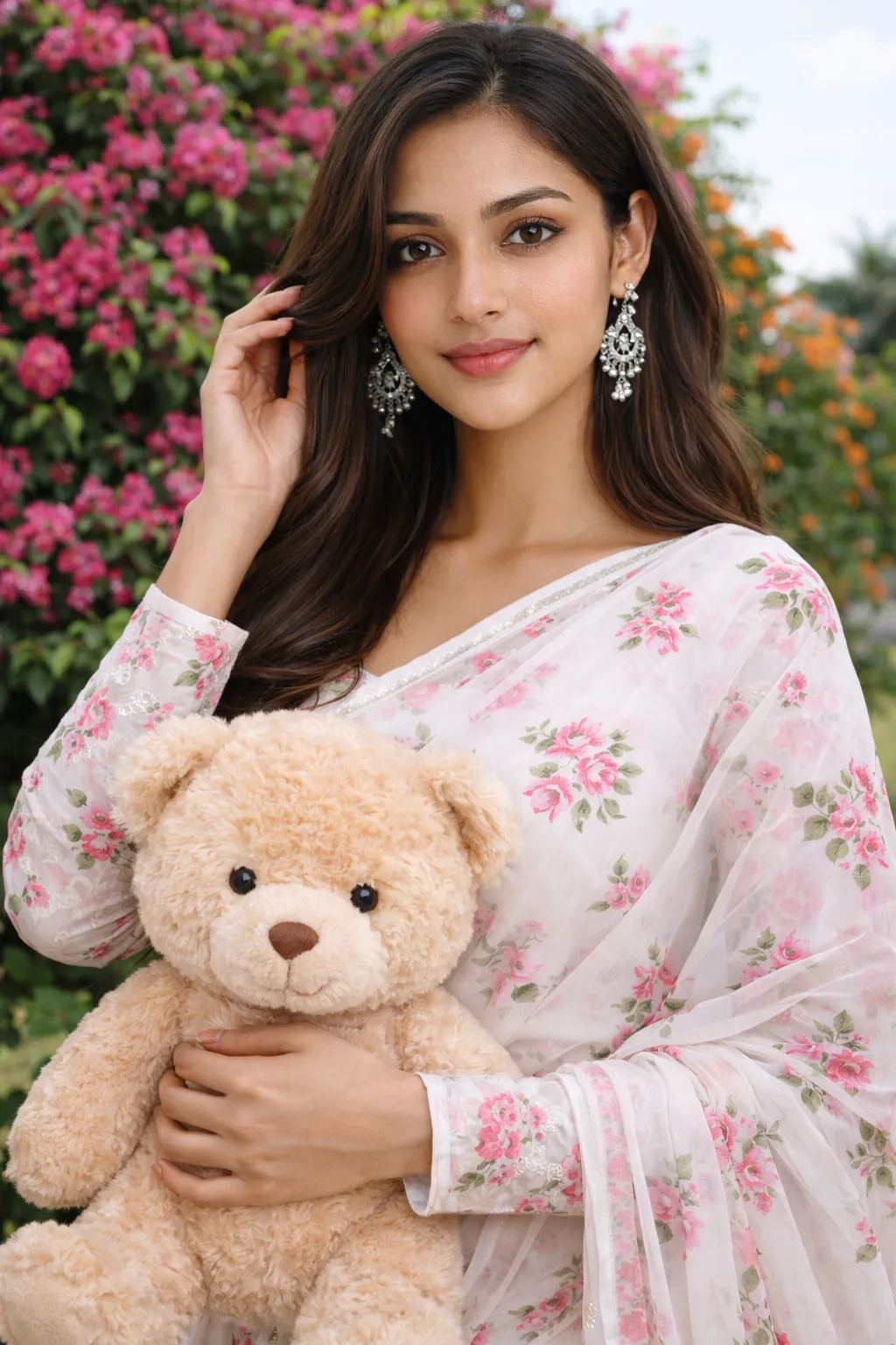 Young Woman in Floral Saree Holding Teddy Bear in Garden Setting